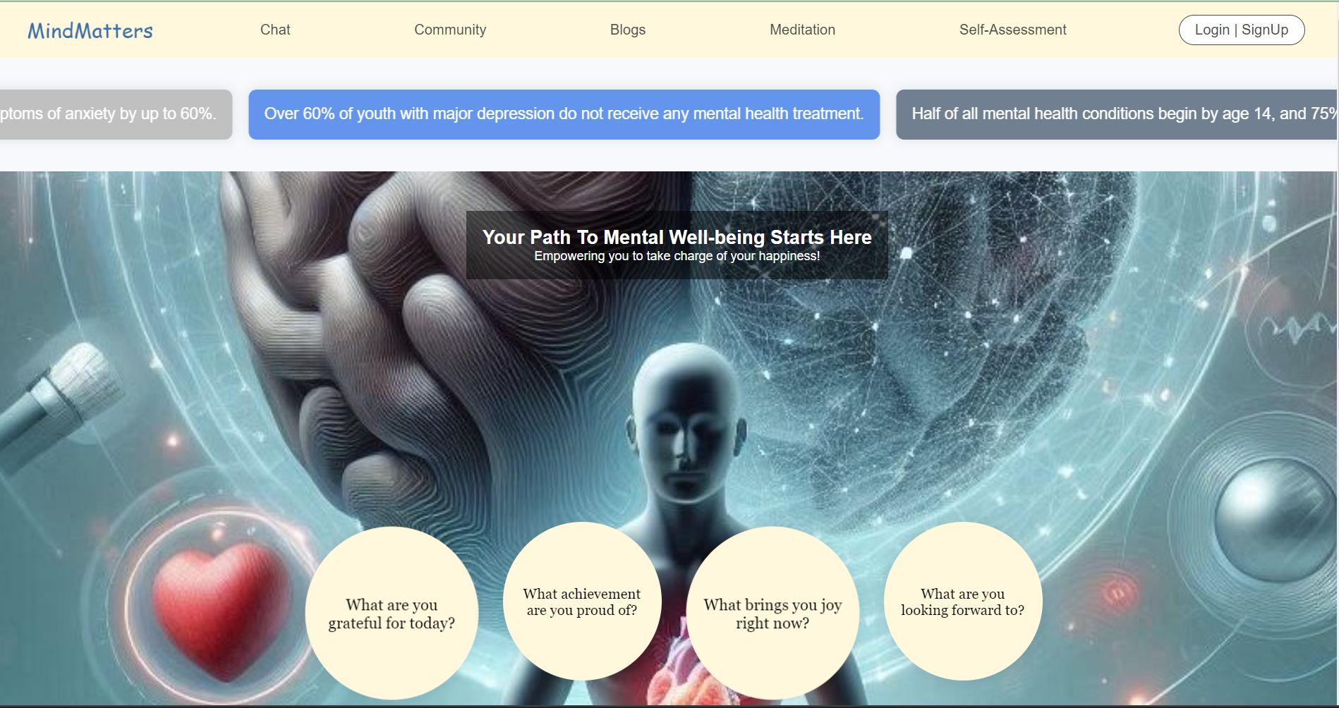 A supportive web application offering resources, articles, and a chatbot for personalized mental well-being and self-care.